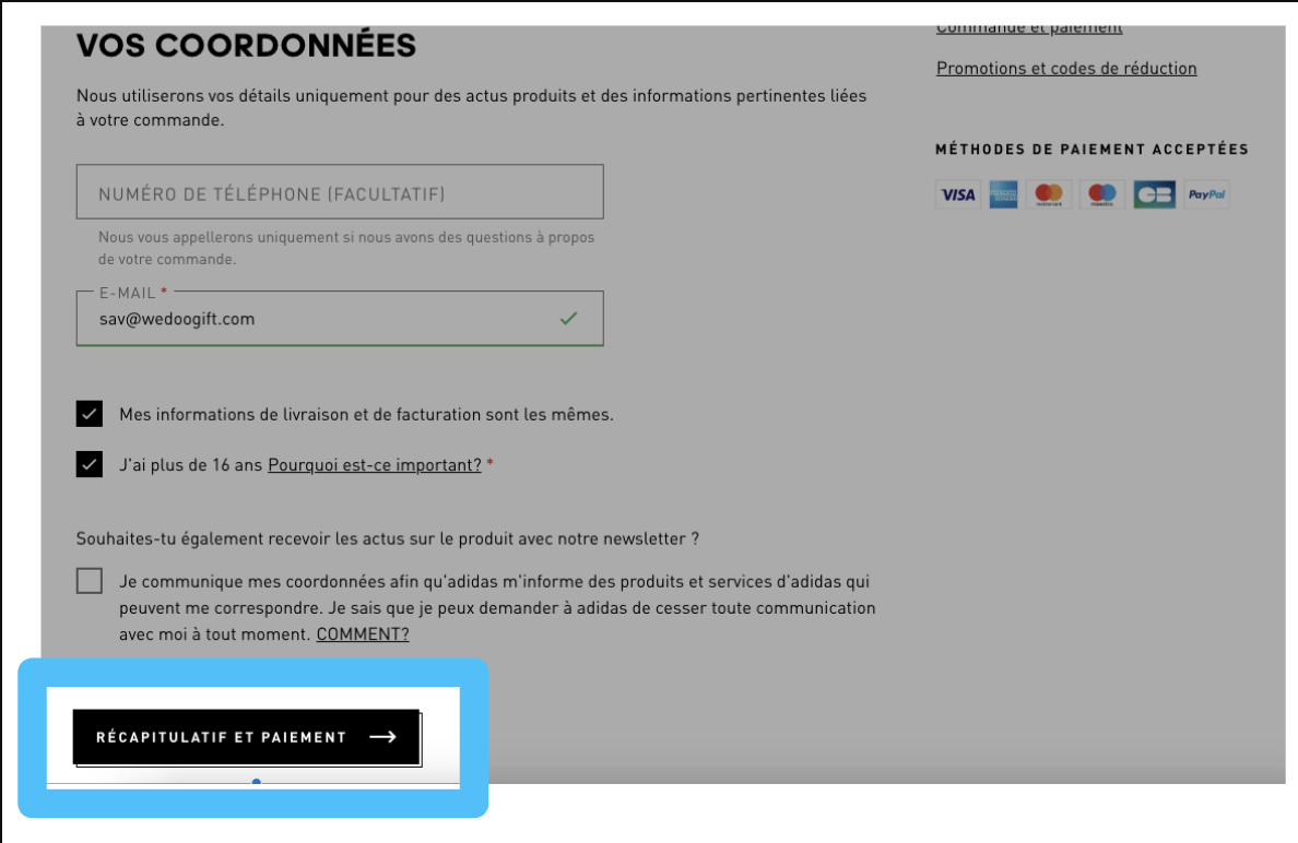 Remplissez vos coordonnées de livraisons puis cliquez sur Récapitulatif et paiement ;