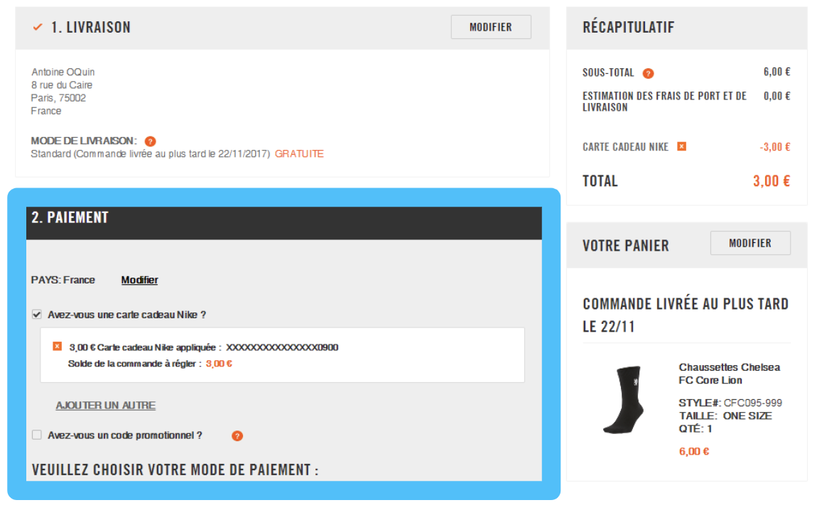 À l'étape 2 du paiement, cochez la case "Avez-vous une carte-cadeau Nike ?" pour faire apparaître 2 cases afin d'y inscrire votre numéro de carte-cadeau.