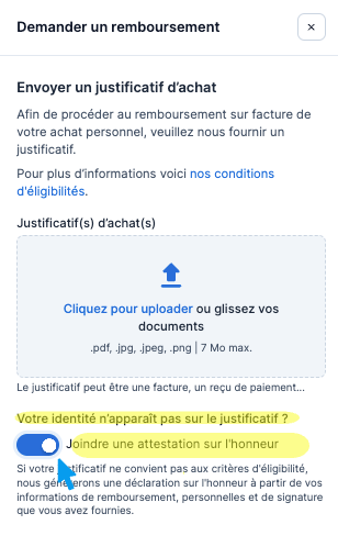 Lorsque vous ajoutez votre document justificatif lors de votre demande de remboursement, cochez la case "Votre identité n’apparaît pas sur le justificatif ?" pour générer automatiquement l'attestation sur l'honneur. 📝